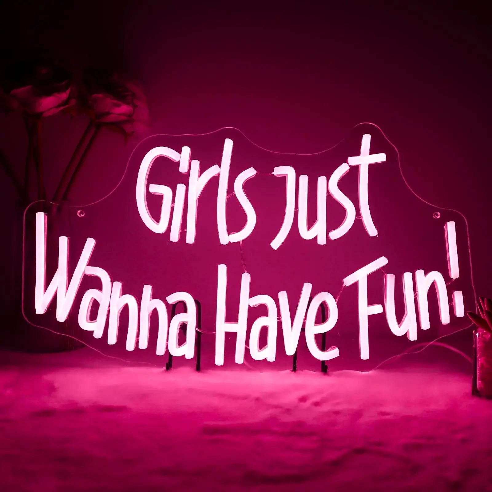 Add a splash of fun to any space with the "Girls Just Wanna Have Fun" neon sign! Perfect for girls' rooms, weddings, or birthday parties, this vibrant LED light brings playful energy and a lively glow that brightens every celebration. Easy to hang and sure to spark smiles!