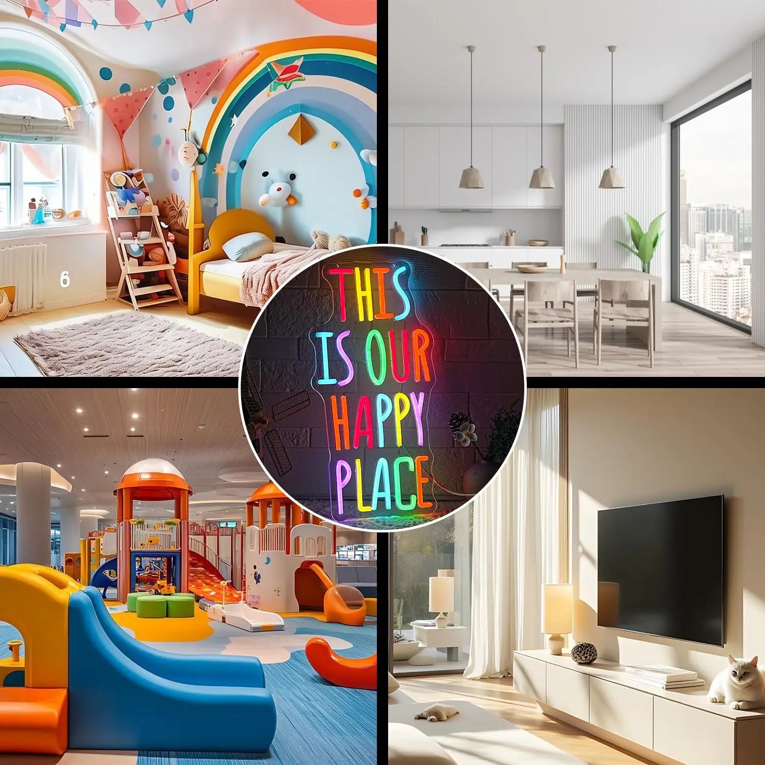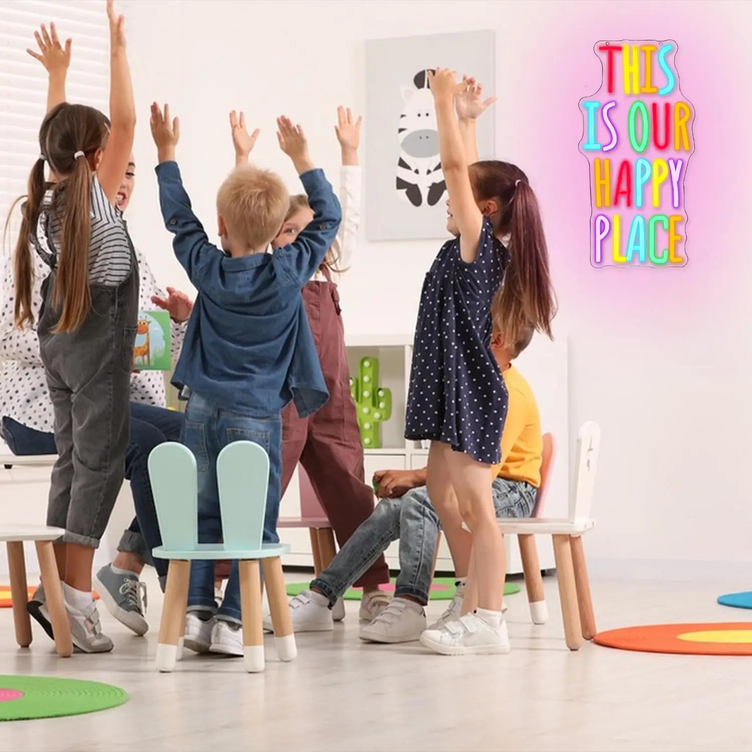 Brighten any room with the "This is Our Happy Place" neon sign! Perfect for gyms, classrooms, bedrooms, or playgrounds, its cheerful LED glow adds fun vibes and uplifting energy wherever it’s hung. Durable and eye-catching, it’s an instant mood lifter that sparks joy in every space.